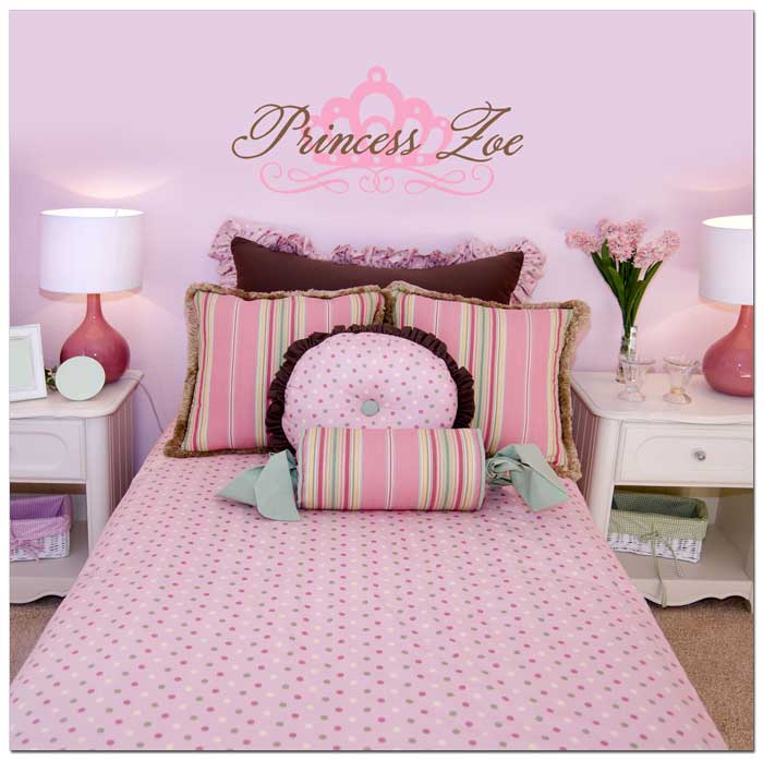 The ‘Princess name room’ wall decals are suitable for your little girl’s bedroom. The photo shows a sample of what we have available. The chocolate brown wall letters and the pink carnation crown are a breathtaking sight! These wall words will look great on any wall focal point in the room: above a headboard, between sconces, next to a lamp shade, window or wardrobe. Waking up to this amazing visual display will do wonders to your daughter’s self esteem!